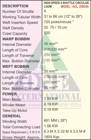 With Newly developed cam design, our 4-Shuttle circular looms can achieve the energy, economy and greatly meters. These are equipped with automatic stopping devices to detect warp or weft breakage and monitoring through sensors.The small size 4 shuttle looms can weave tubular cloth from 12” to26”